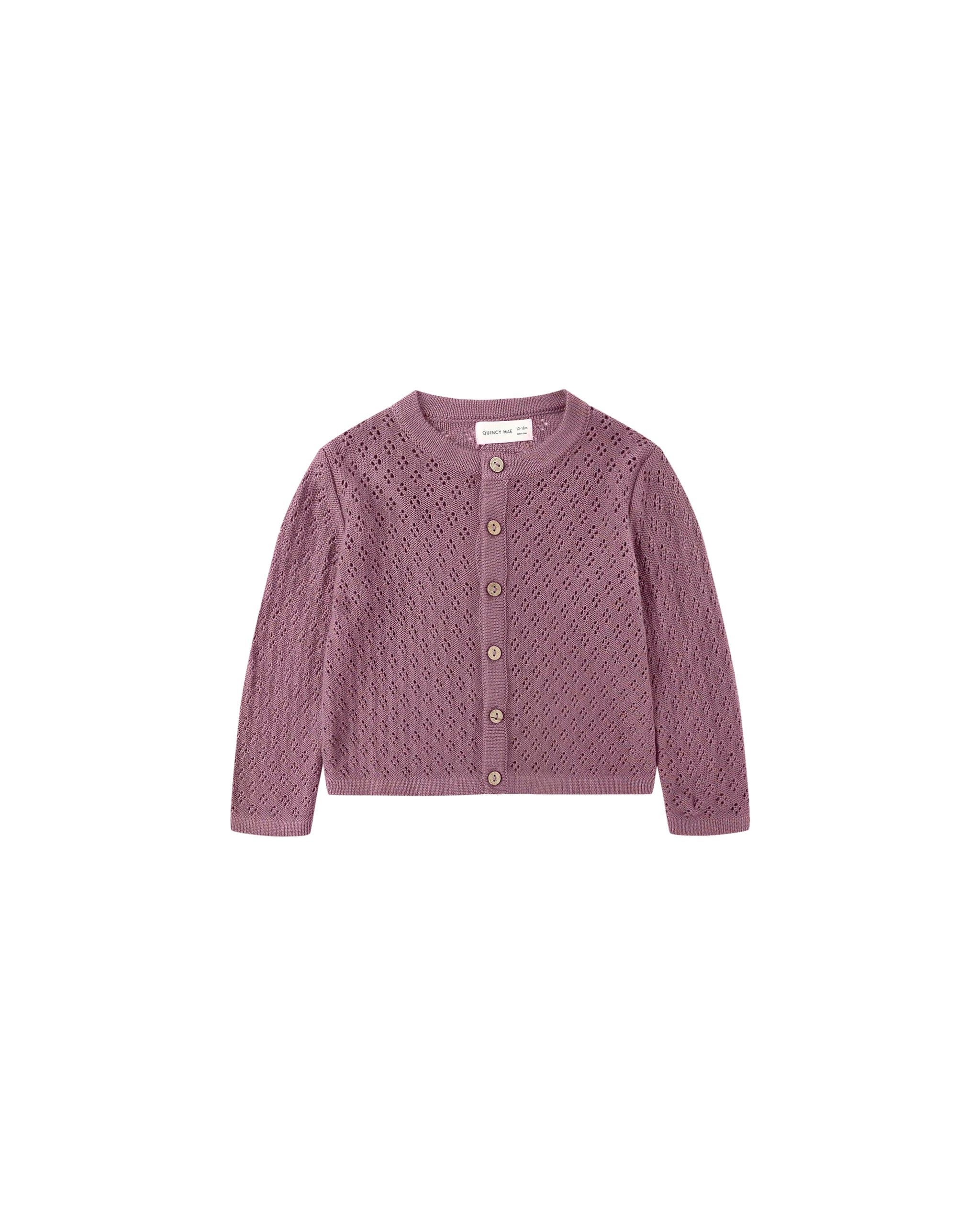 This darling cardigan showcases a beautiful pointelle knit design and coconut buttons for an extra sweet look.Featuring a ‘mulberry’ hue.Machine wash cold. Lay flat to dry.Made of 70% recycled polyester / 30% acrylic.