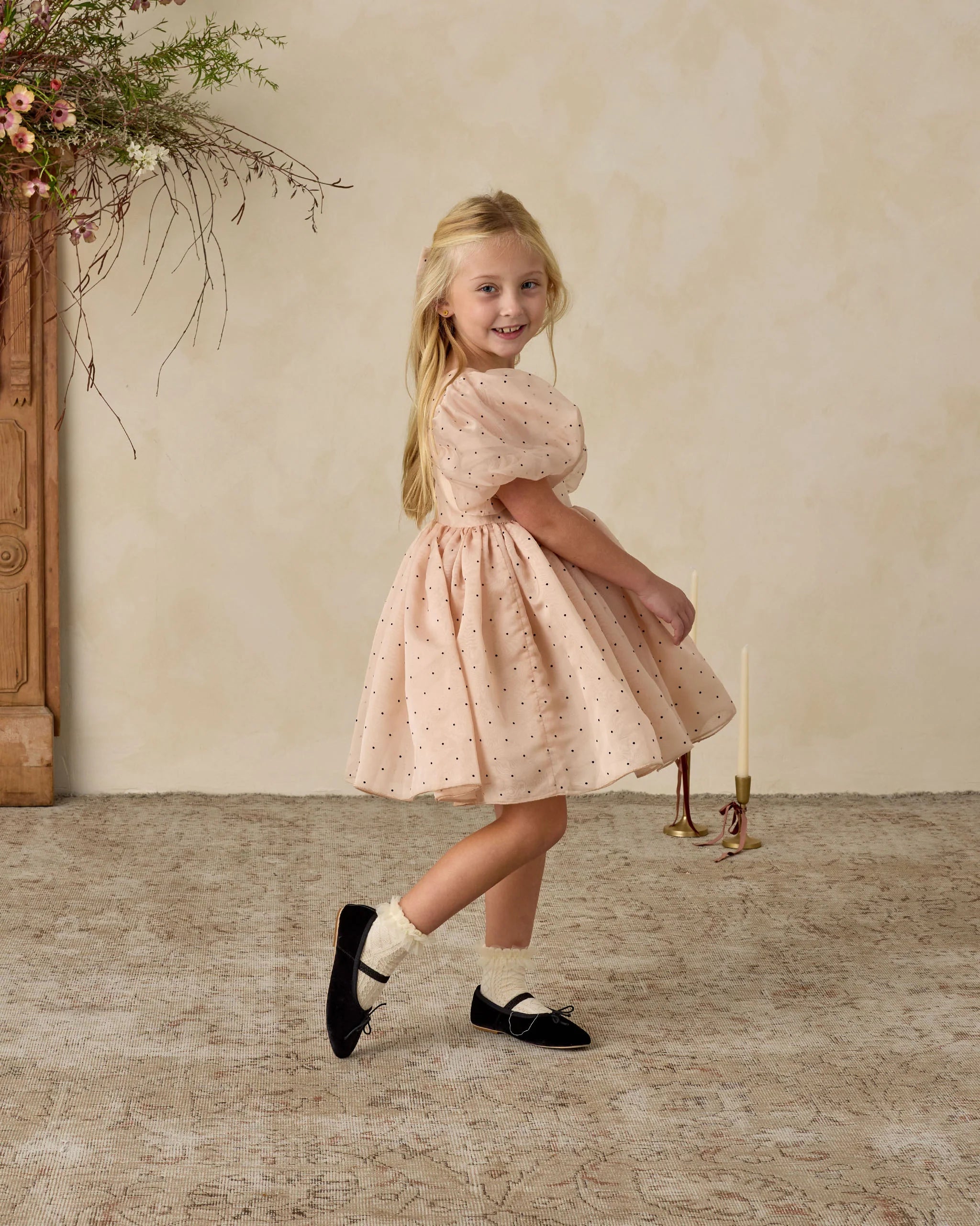 Our Sofia Dress captures all the fairy princess feels with oversized balloon puff sleeves, a V-back with zip closure, and a full, twirl-worthy skirt crafted in flocked organza. Coordinating bloomers included with sizes 12M - 2Y.