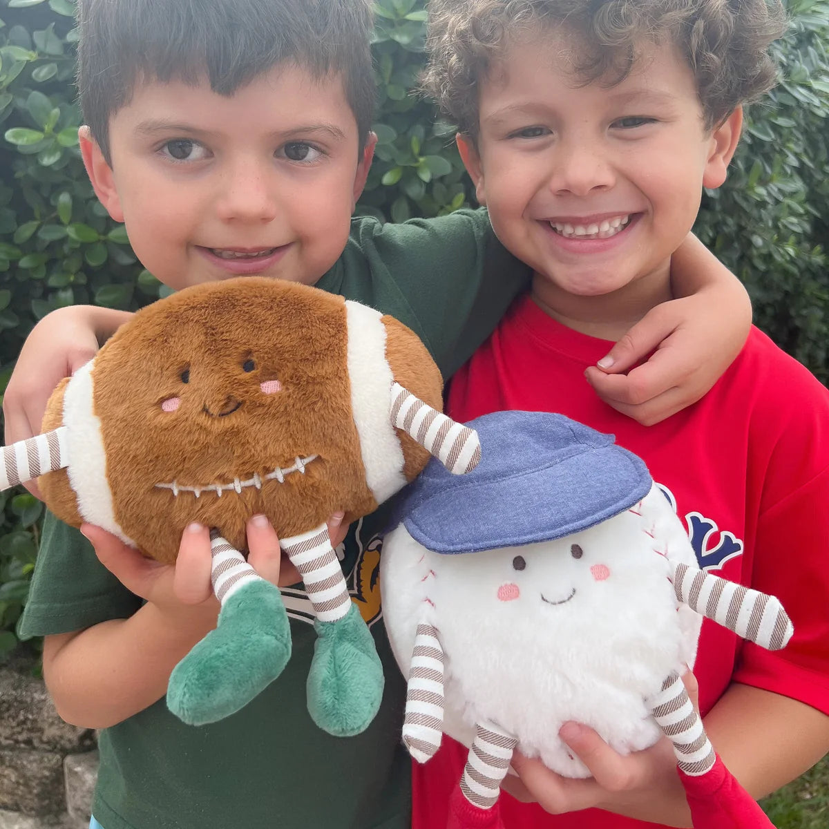 Meet Freddie Football, the cuddliest MVP of the game! With his super soft, textured brown fur and signature white stitching, Freddie puts a snuggly spin on classic football fun. His cheerful embroidered face, complete with rosy cheeks, brings playful charm, while his striped arms and legs, topped with green plush sneakers, have him ready to score big in both playtime and snuggle time. Whether he's the star of an imaginary touchdown or a cozy cuddle buddy, Freddie Football is the perfect teammate for any little athlete's plush collection.